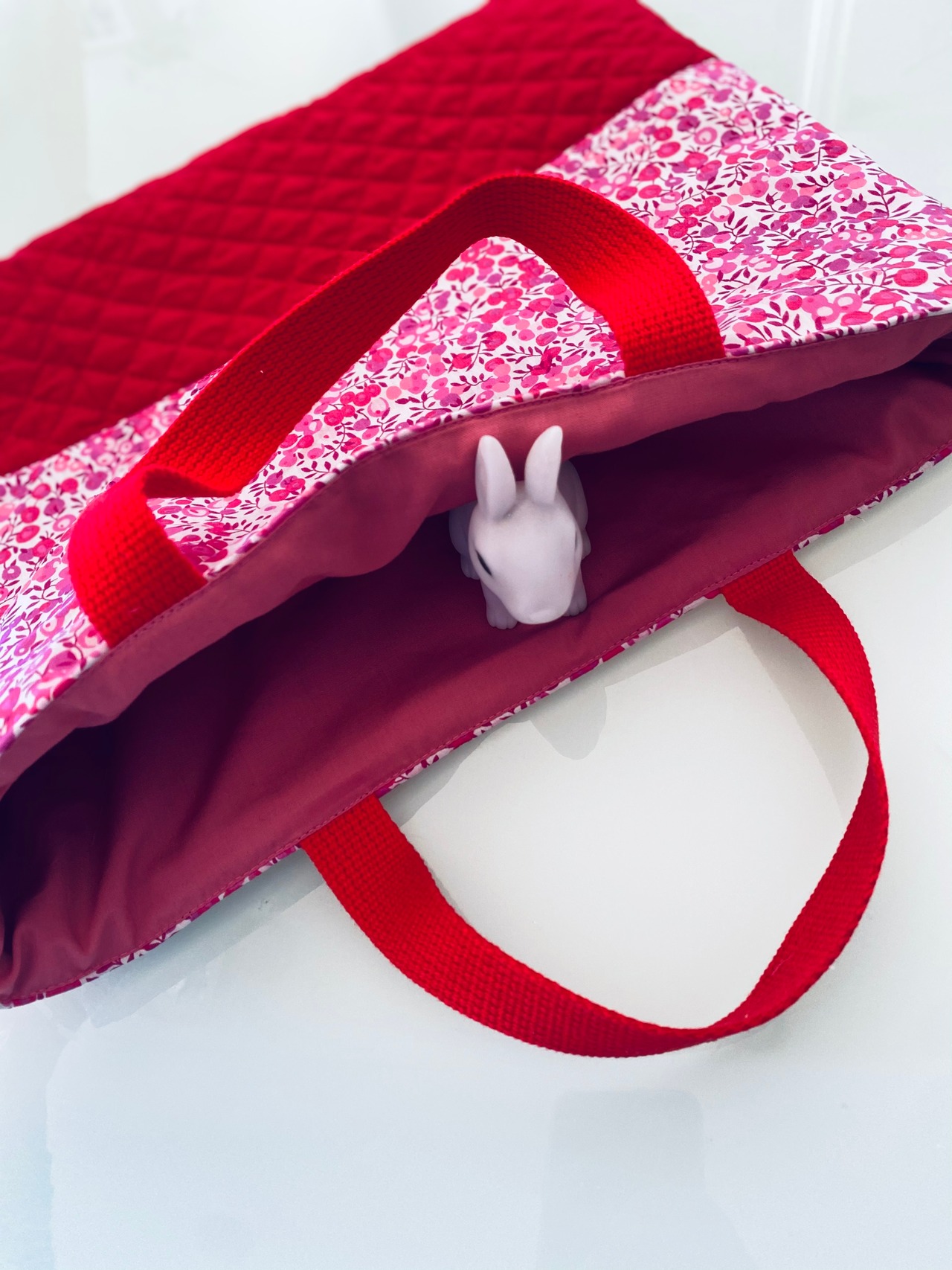 厚みのあるキルティングと、リバティ生地 ウィルトシャー柄の切り替えです。